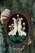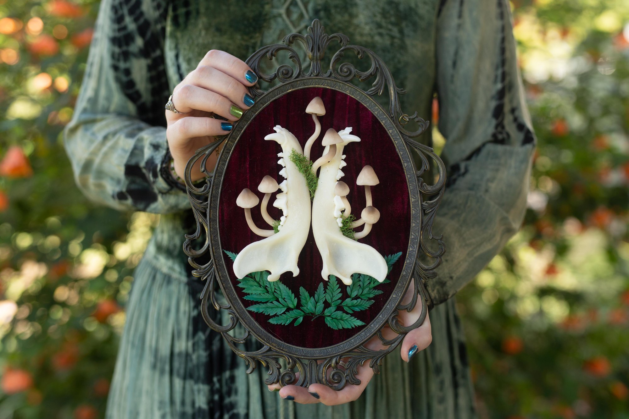 Complete with handmade polymer clay mushrooms and dried florals.