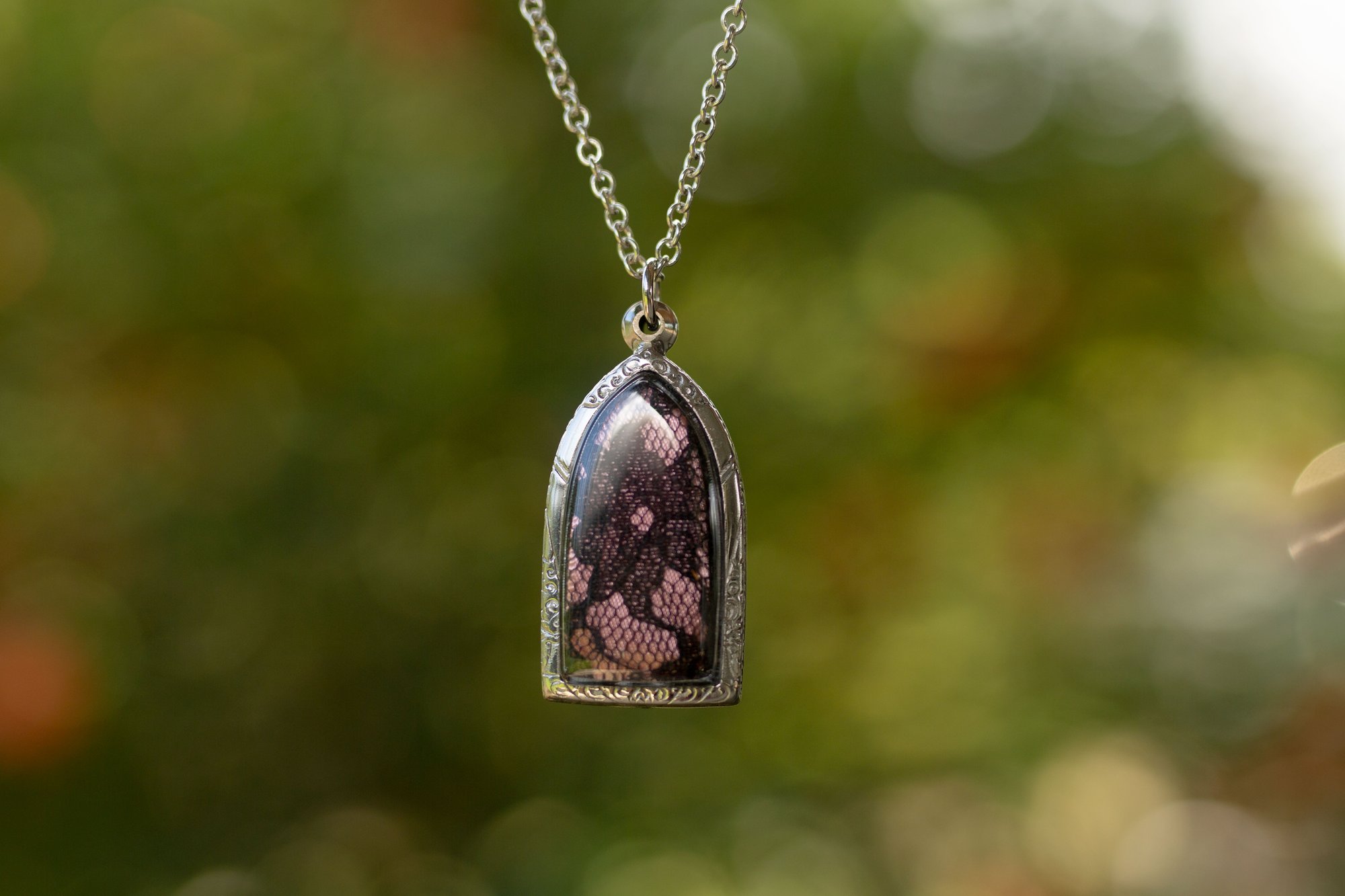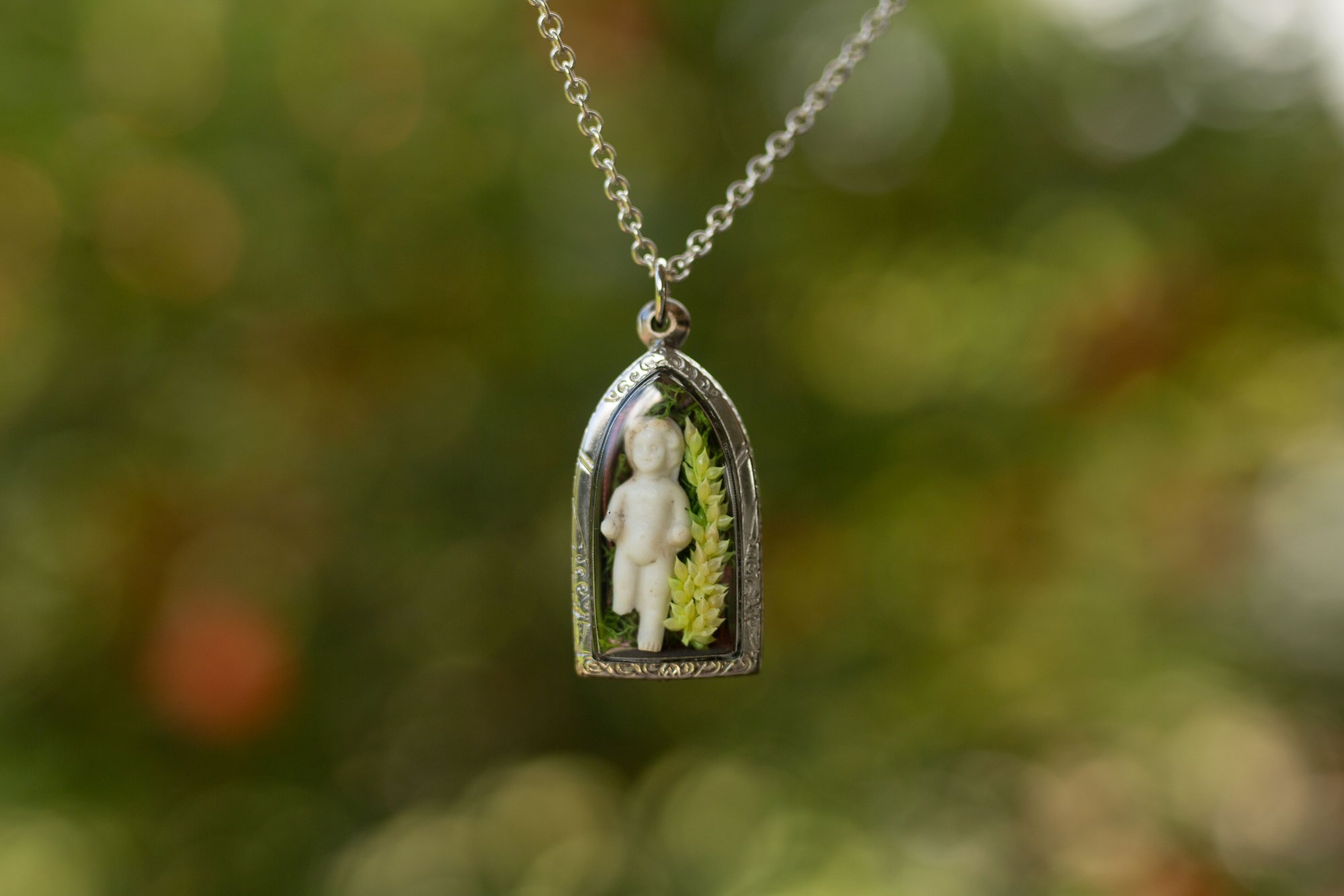 Small antique Frozen Charlotte doll with moss, dried florals, and a lace backing.